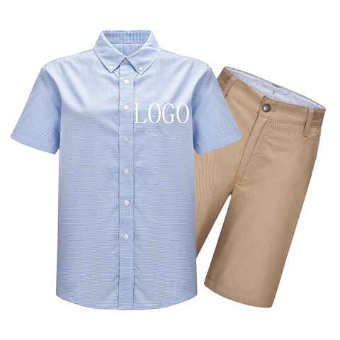 Nueva Camisa de algodón de verano de manga corta personalizada Logotipo personalizado Conjuntos de uniformes OEM Uniforme de estudiante de escuela internacional para niñas y niños